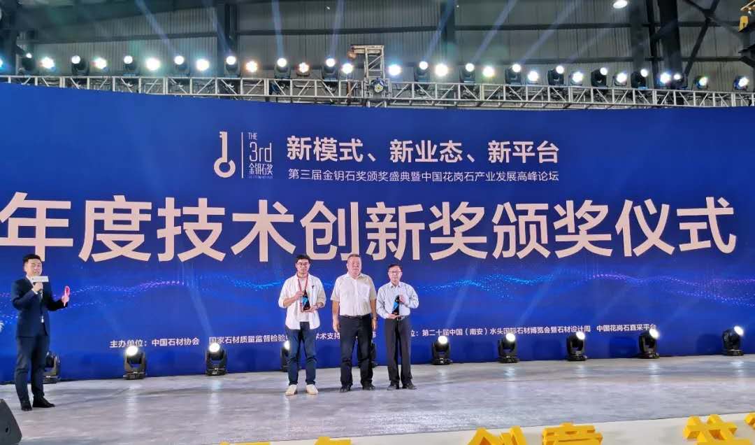 2019年11月8日下午,年度行業(yè)盛會(huì)“第三屆金鑰石獎(jiǎng)?lì)C獎(jiǎng)盛典”在中國(guó)水頭石材產(chǎn)業(yè)展示運(yùn)營(yíng)中心隆重舉行?铺貦C(jī)械憑借行業(yè)首創(chuàng)、自主研發(fā)的“石材信息化3P解決方案”,繼【中國(guó)建材行業(yè)技術(shù)革新一等獎(jiǎng)】、【中國(guó)石材行業(yè)技術(shù)革新一等獎(jiǎng)】后,又獲殊榮,摘取【第三屆金鑰石—年度技術(shù)創(chuàng)新獎(jiǎng)】。
